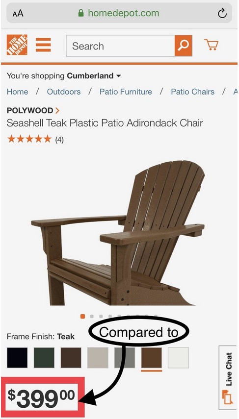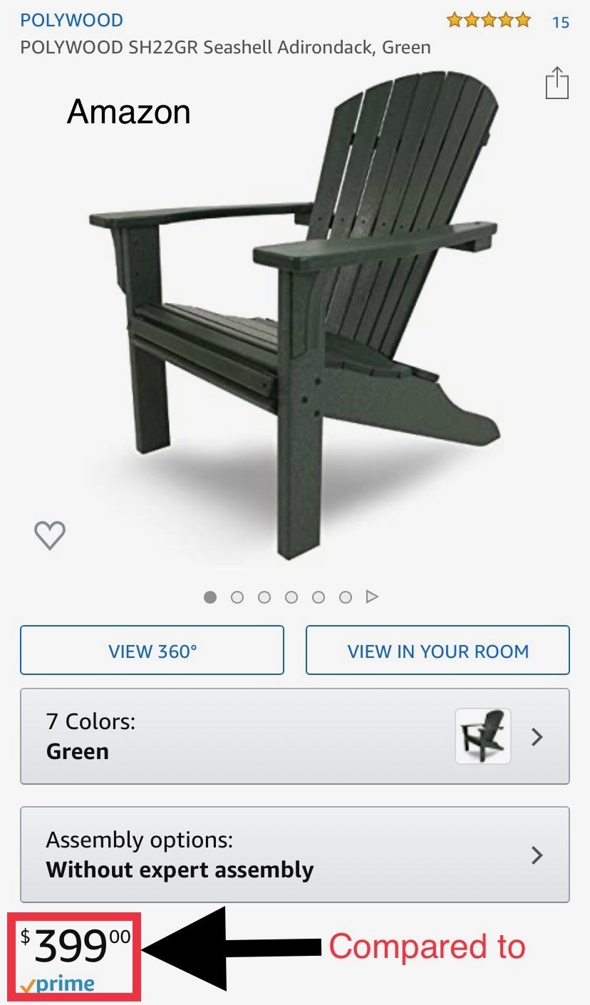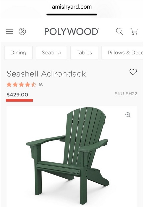 We offer high-quality Amish-made poly folding Adirondack chairs at near-wholesale pricing. Our chairs are often compared to the Polywood Seashell Adirondack Chair, which retails for $429 and is not foldable. Unlike many mass-produced chairs, our designs feature hidden hardware for a cleaner, more refined look. As a locally owned Northern Virginia business with no corporate overhead, we’re able to offer exceptional value on a comparable premium product.